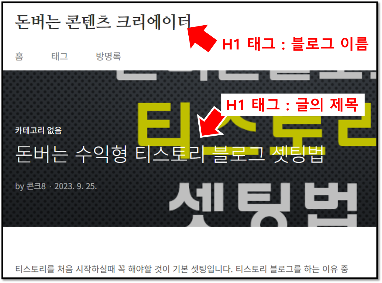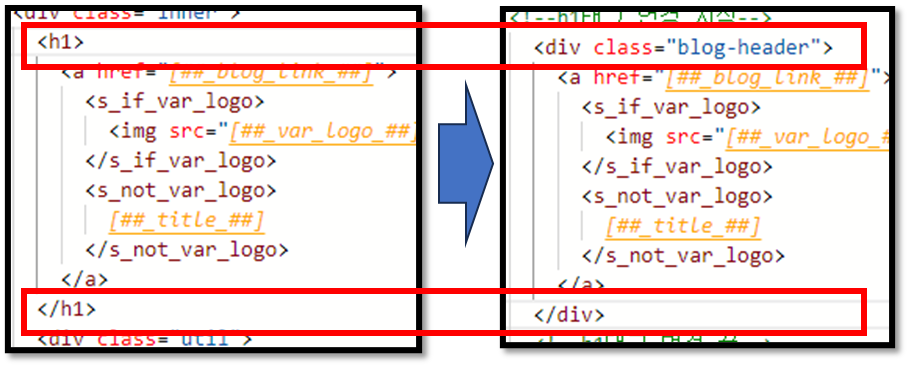변경할 부분은 블로그 이름 h1 태그입니다. 사람들이 검색할때는 포스팅 제목을 보고 들어오기 때문에 포스팅 제목의 h1은 그대로 살려둘 꺼예요.