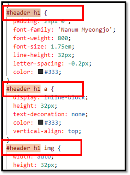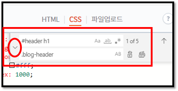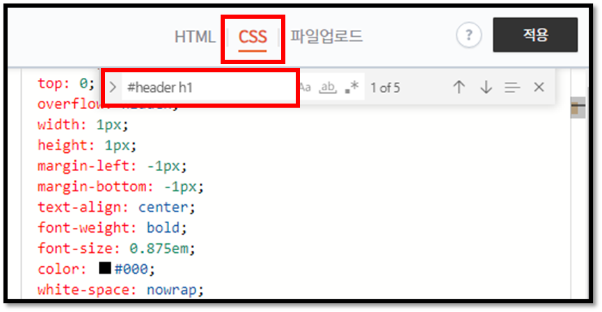상단 CSS 창으로 이동 합니다. CSS창에서 'Ctrl+F'를 한 후 '#header h1'을 검색합니다. 화면을 내리면 총 5개가 보일 겁니다.