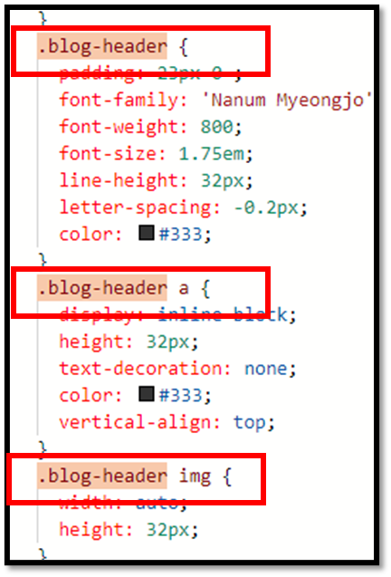 지금부터 5개를 한꺼 번에 바꿀테니 잘 쫓아 오세요. 아래 그림 처럼 > 아이콘을 클릭 한 후 '.blog-header' 넣어준 후 5번 엔터를 칩니다. 하나씩 변경되는게 보이실 겁니다. 불안하시면 하나씩 찾아서 변경해 주셔도 됩니다. ^^