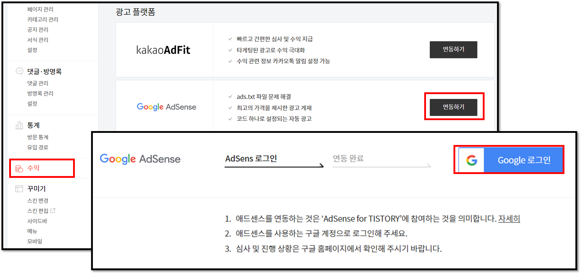 애드센스와 티스토리 통계를 연결하겠습니다. 왼쪽 메뉴 중 '수익'을 클릭한 후 구글애드센스 '연동하기'를 클릭합니다. 'Google 로그인' 파란 버튼을 클릭합니다.