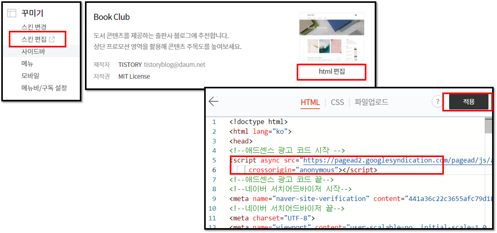 왼쪽 메뉴 중 '꾸미기/스킨편집' 클릭 후 오른쪽에 'html편집' 클릭합니다. 구글애드센스에서 복사한 코드를 <head>에 붙여 넣습니다. '적용'을 클릭하면 버튼이 색이 변하면서 저장이 됩니다.