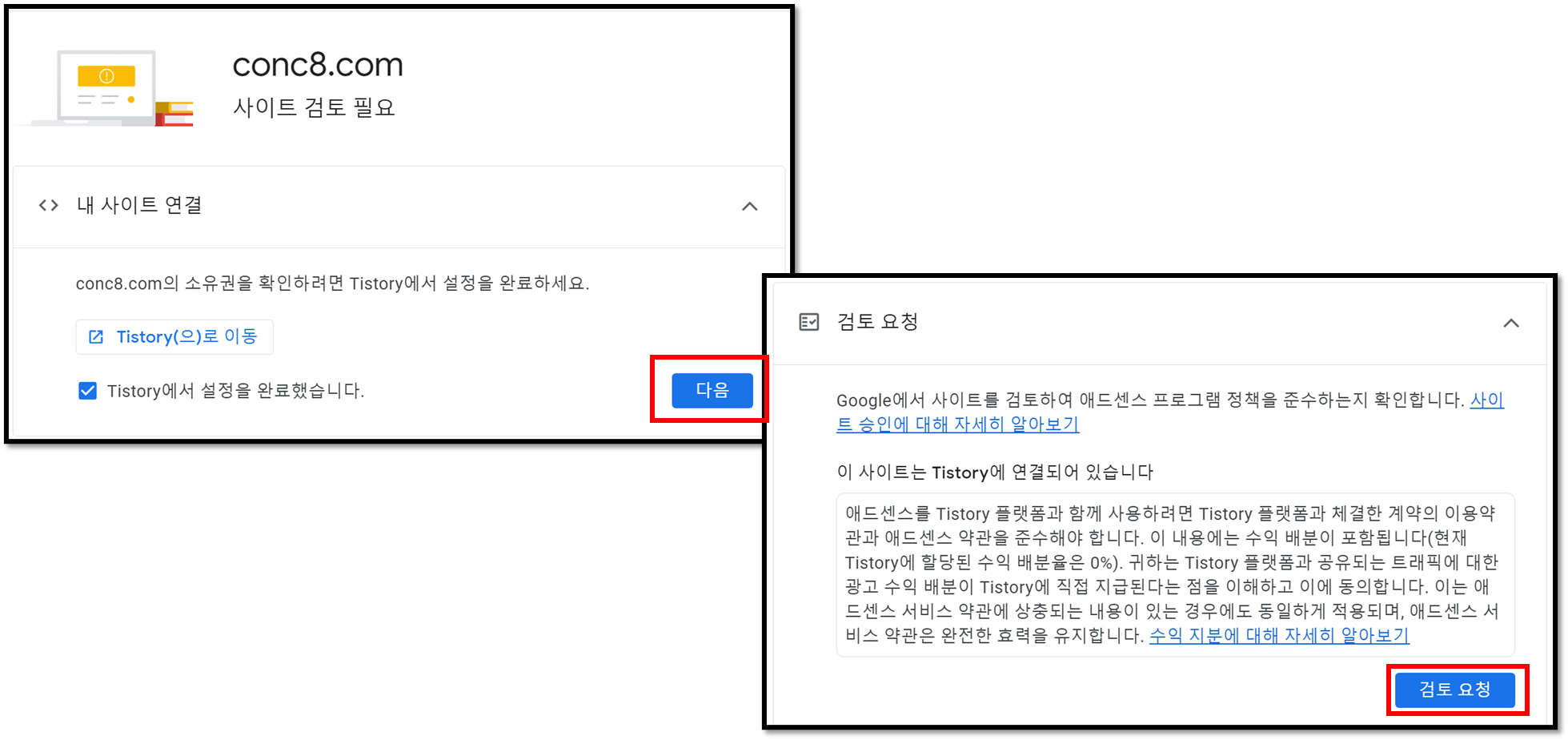 다시 애드센스로 온 후 내 블로그를 '검토 요청' 합니다. 위에서 붙여넣기 한 코드가 바로 검토요청을 하기 위한 준비단계였습니다.