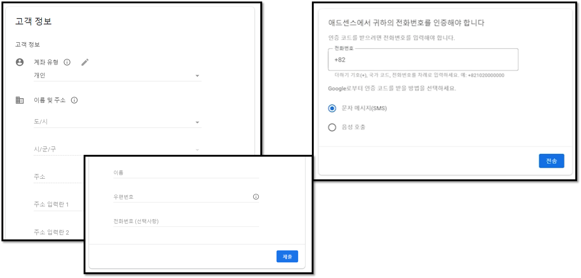 아래 정보를 다 입력하세요. 정확하게 입력하셔야 합니다. 광고승인이 나면 여러분의 주소로 우편물이 오는데 거기에 승인 코드가 있습니다. 그러기 때문에 꼭 정확한 정보를 입력하셔야 합니다. 한글로 입력하시면 됩니다. 전화번호 승인도 하세요.
