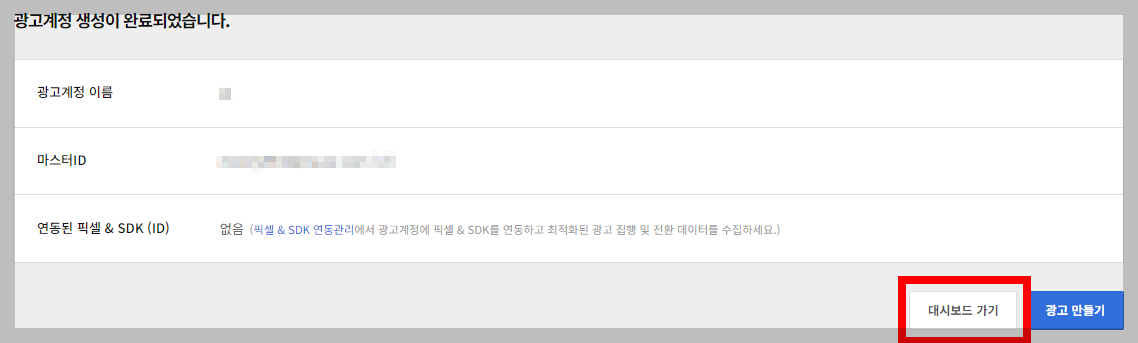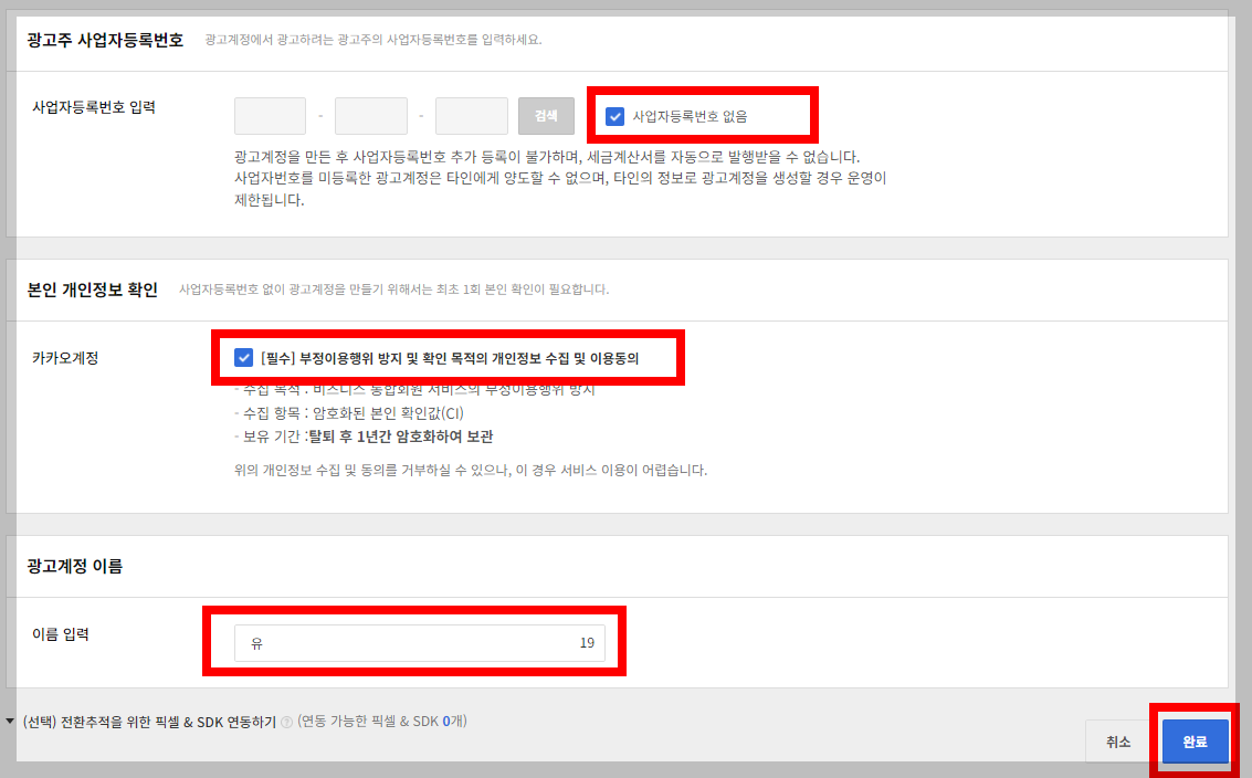 아래와 같이 클릭한 후 마지막에 '광고계정 이름'을 아무거나 적습니다. '완료'클릭합니다.
