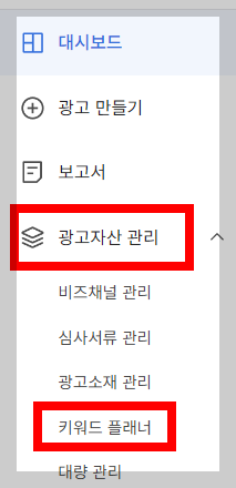 왼쪽 메뉴 중 '광고자산관리-키워드 플래너' 클릭합니다.