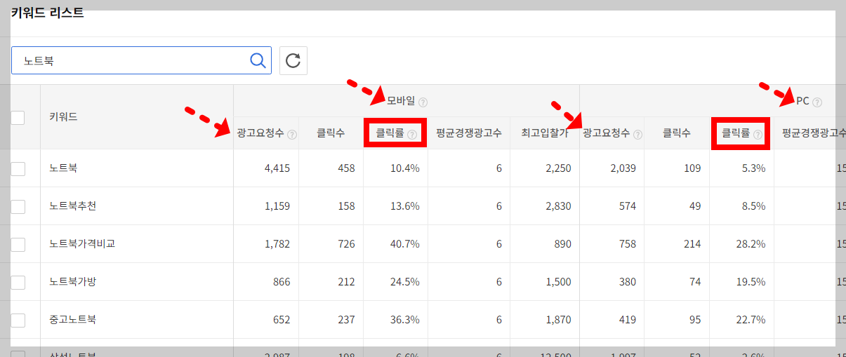 전 '노트북'을 검색해 보았습니다. 모바일과 PC로 구분해서 나옵니다. 광고요청수와 클릭률을 기준으로 보시면 되는데요. 내가 광고를 하는 입장에서는 광고요청수와 최고입찰가를 보시면 되겠지요. 제휴마케팅이나 인기 키워드를 하시는 분들은 클릭률을 더 보시면 좋을 것 같습니다.