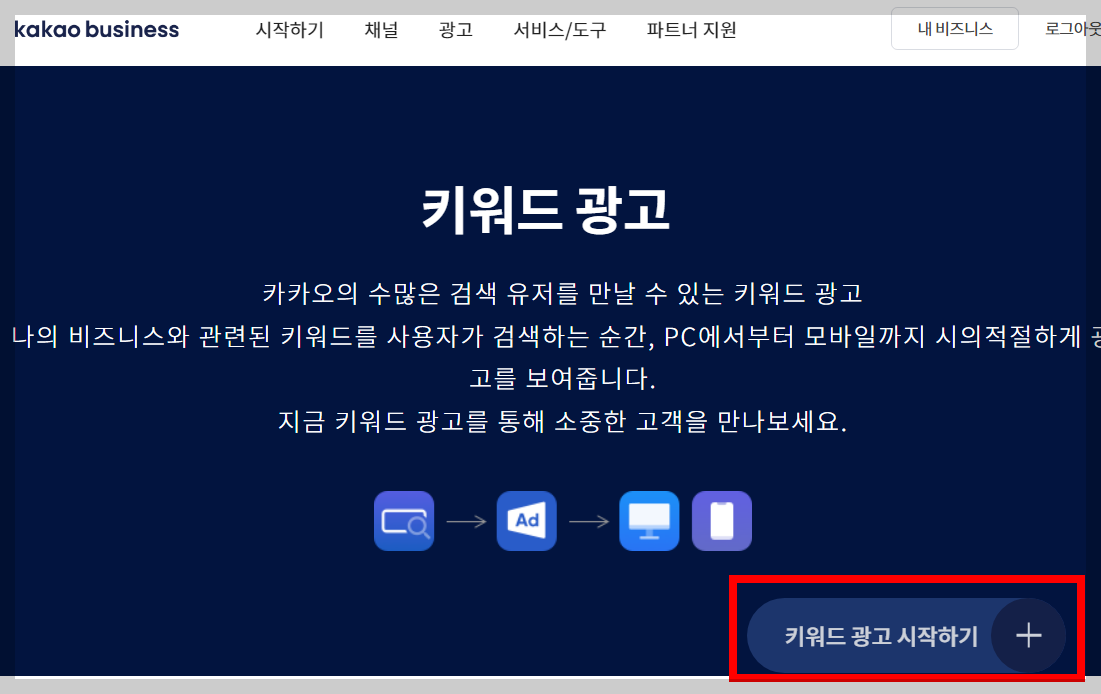 다음이나 네이버에서 '카카오 키워드 광고' 라고 검색 합니다. 카카오 비즈니스 웹사이트에 들어갑니다.