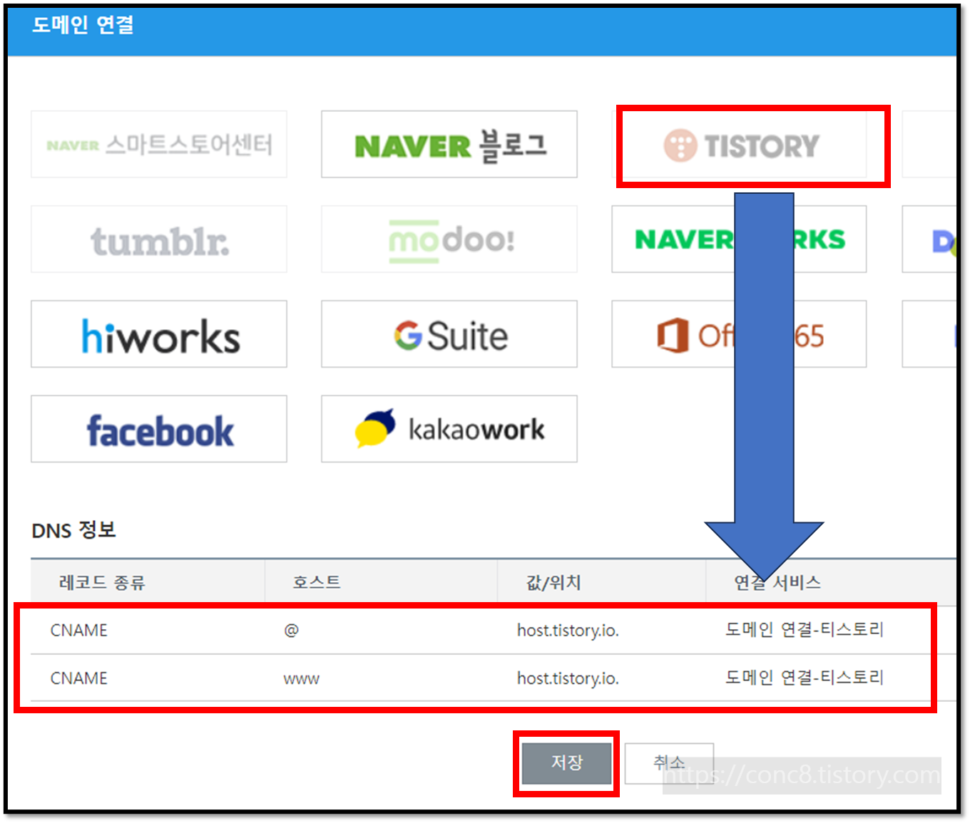 티스토리(TISTORY)를 클릭하면, 아래에 DNS 정보가 자동 추가 됩니다. '저장'클릭하세요.
