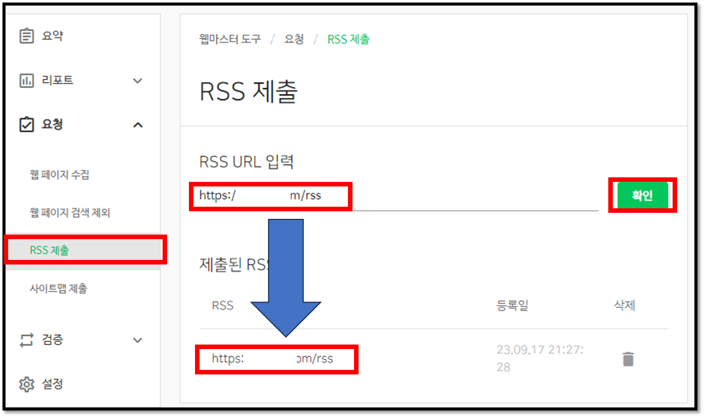 왼쪽 메뉴 '요청/RSS제출'을 클릭하면 오른쪽 화면이 나옵니다. '내 블로그 주소/ rss' 를 입력한 후 '확인'을 누릅니다. 아래에 RSS가 제출되게 됩니다. (자동등록방지 보안 절차를 거친 후 '확인' 클릭합니다)
