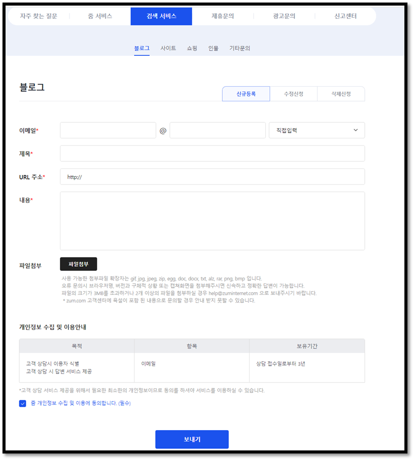 아래 부분을 다 입력하고 '보내기' 버튼을 클릭합니다. 줌(zum)을 별도로 로그인이 필요없습니다.