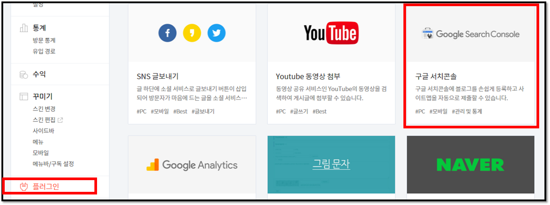 왼쪽 메뉴 중 '플러그인' 클릭합니다. '구글 서치콘솔' 클릭합니다.