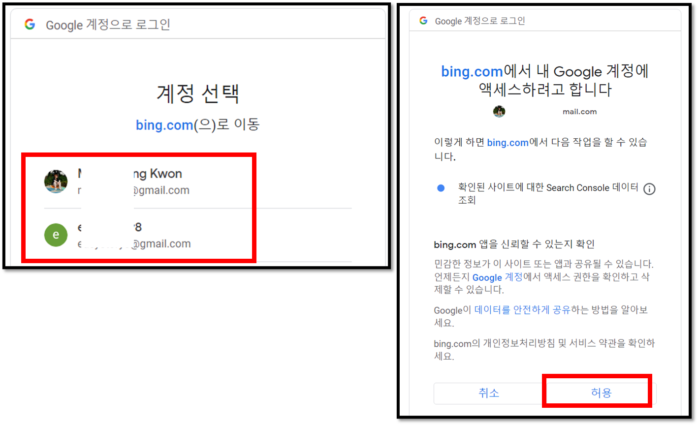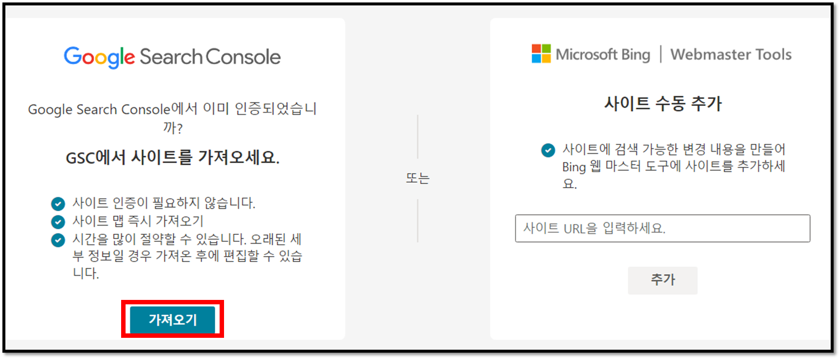 빙 웹마스터 도구 웹사이트에 들어가서 '시작하기' 클릭, '구글' 클릭, 구글이메일로 로그인 하세요. 구글서치콘솔 로그인과 같은 이메일로 하길 권장합니다.
