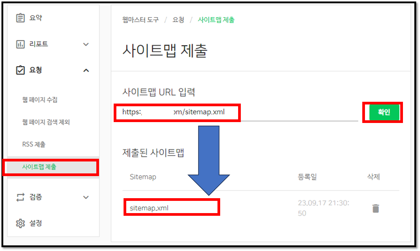 왼쪽 메뉴 '요청/사이트맵 제출' 을 클릭하면 오른쪽 화면이 나옵니다. '내 블로그 주소/sitemap.xml'을 입력한 후 '확인'클릭합니다. 아래에 사이트맵이 등록 되었습니다.