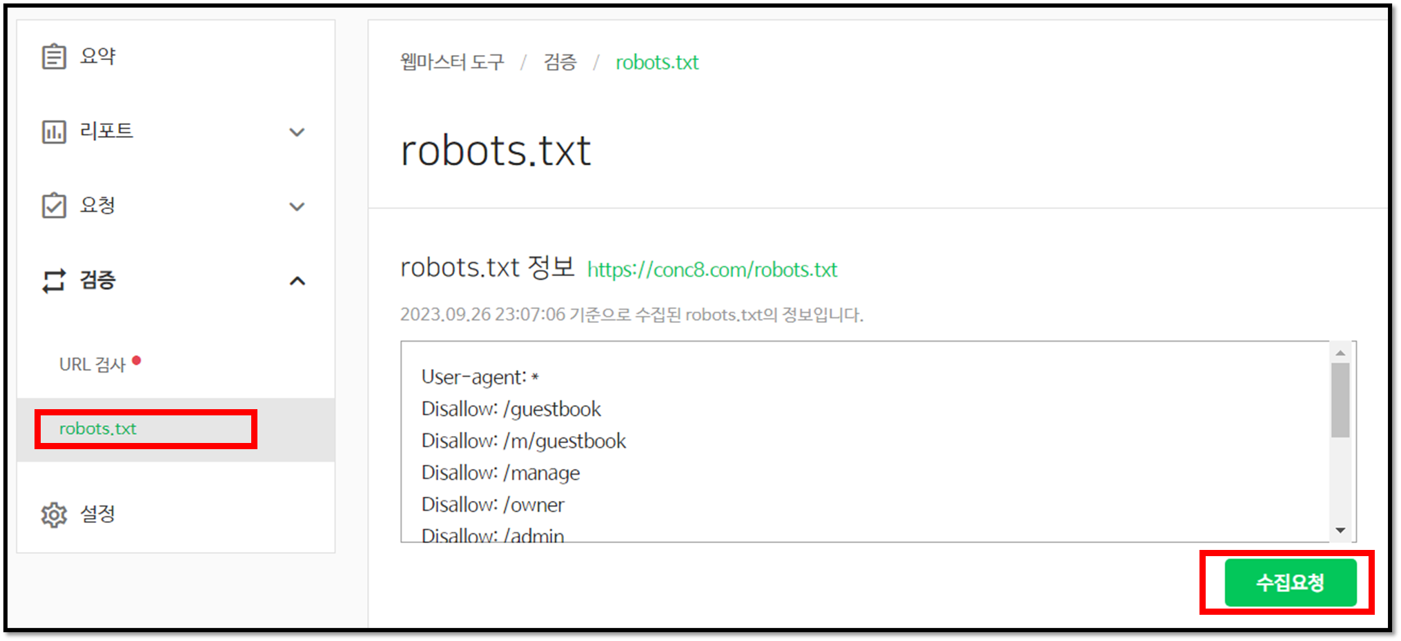 왼쪽 메뉴 중 'robots.txt'클릭합니다. 오른쪽에서 '수집요청'을 클릭합니다.