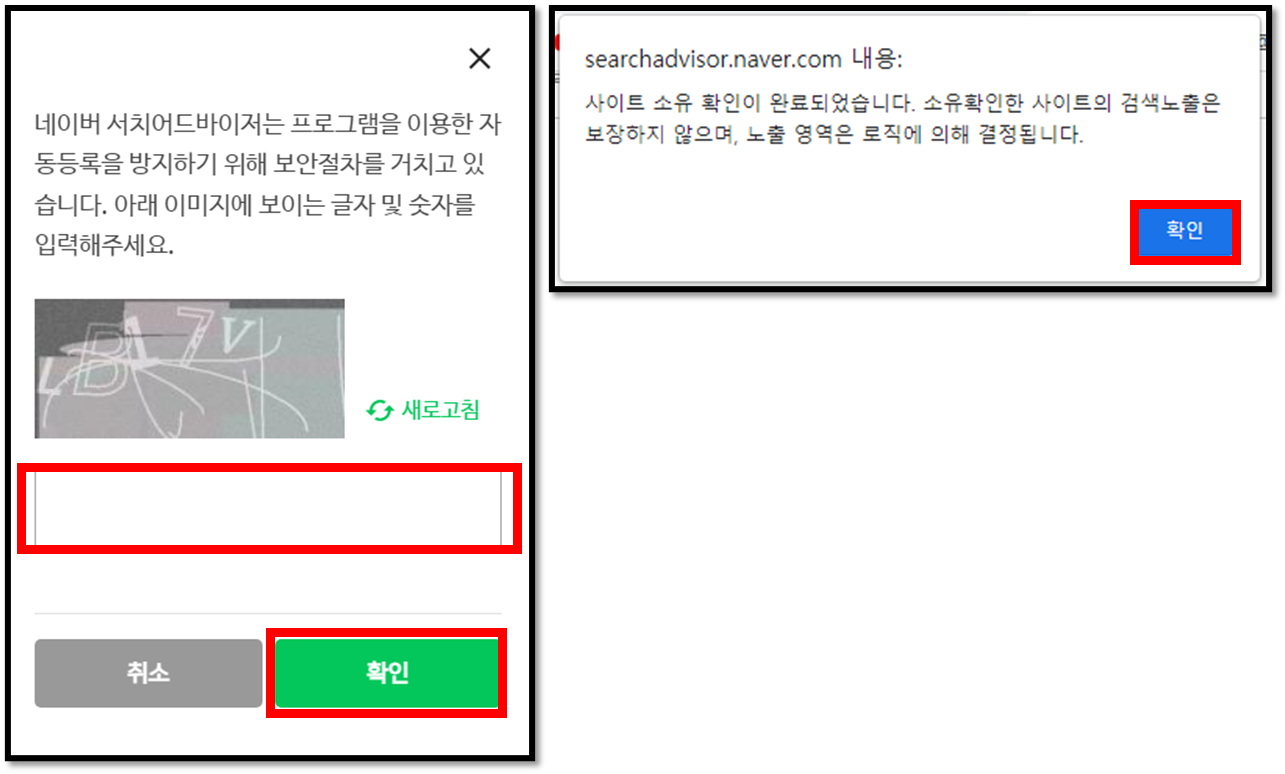 자동등록 방지 보안절차를 거친 후 '확인'을 클릭합니다. 사이트 소유확인 창이 뜹니다. '확인' 클릭합니다.