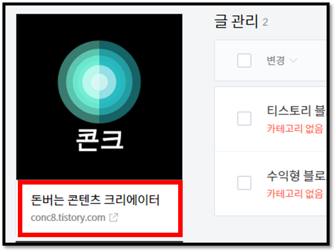 티스토리 관리자페이지 왼쪽에서 주소를 확인하실 수 있습니다. 저는 2차도메인을 연결 했기 때문에 2차 도메인으로 넣었습니다. 아래는 티스토리 블로그 주소의 예입니다. 자신의 주소를 드래그 하거나 주소를 클릭 후 새창이 뜨면 주소창에서 복사 하셔도 됩니다. 예)oooo.tistory.com