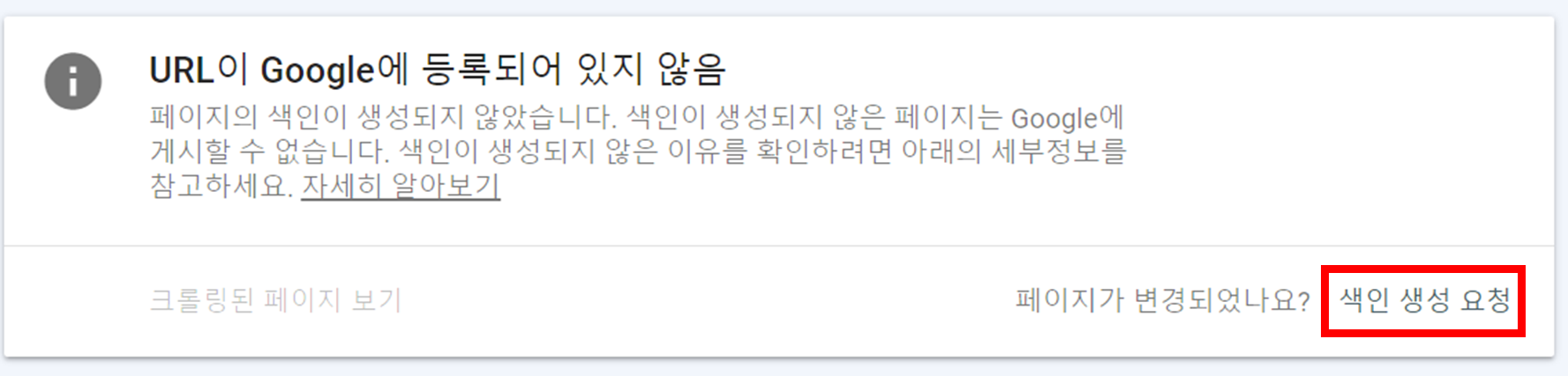 내 글이 구글에 등록되지 않았다고 나옵니다. '색인 생성 요청'을 클릭합니다.