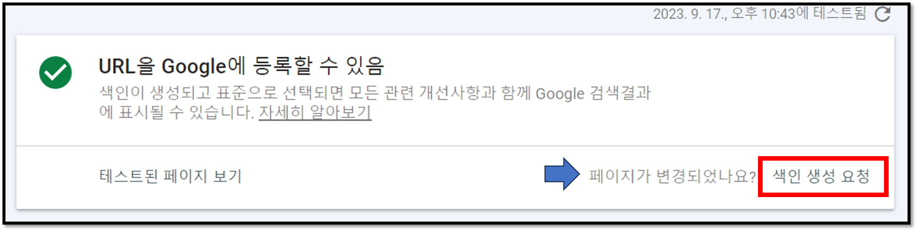 아래와 같이 나오면 '색인생성요청'을 다시 클릭하여 업데이트 된 페이지를 색인요청을 하실 수 있습니다.