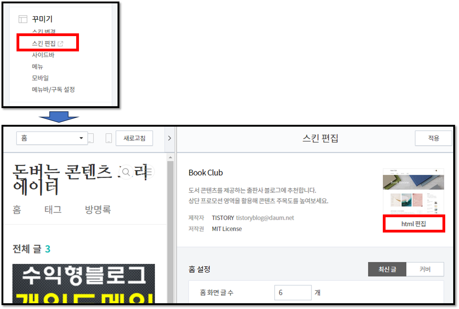 티스토리 블로그의 관리자 페이지로 들어갑니다. 왼쪽 메뉴 중 '꾸미기/스킨편집' 클릭한 후 'html편집'을 클릭합니다.