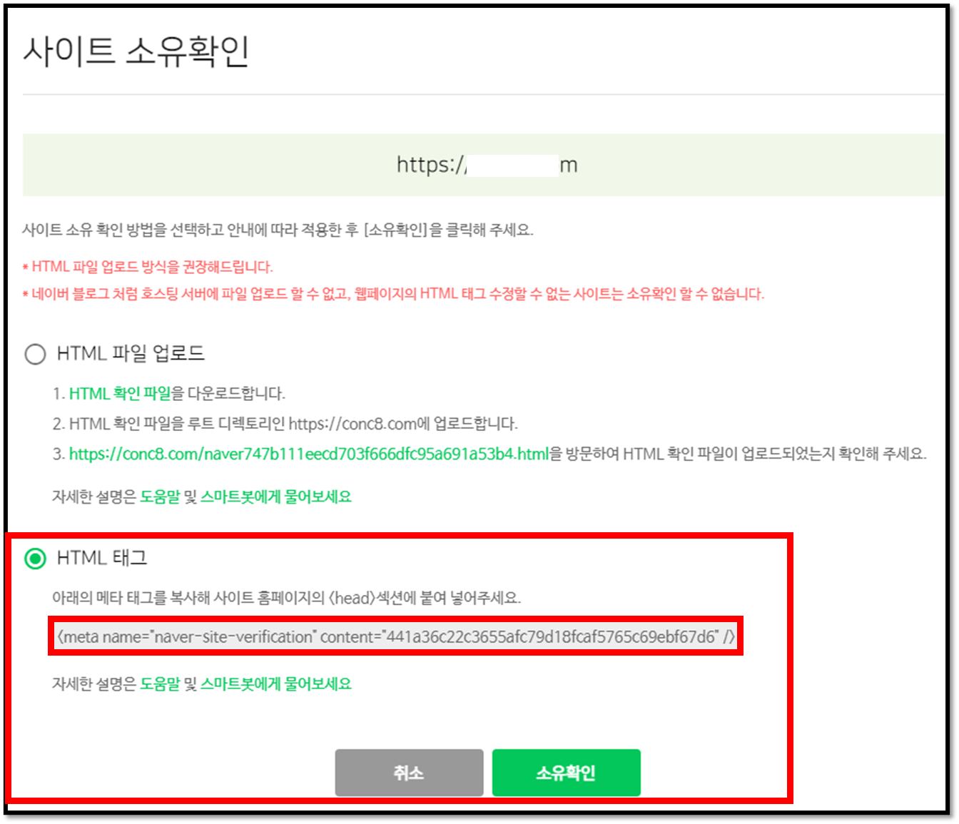 네이버 서치어드바이저에서 아래와 같이 '사이트 소유확인' 이 나옵니다. 'HTML 태그'를 선택한 후 메타태그를 복사합니다.