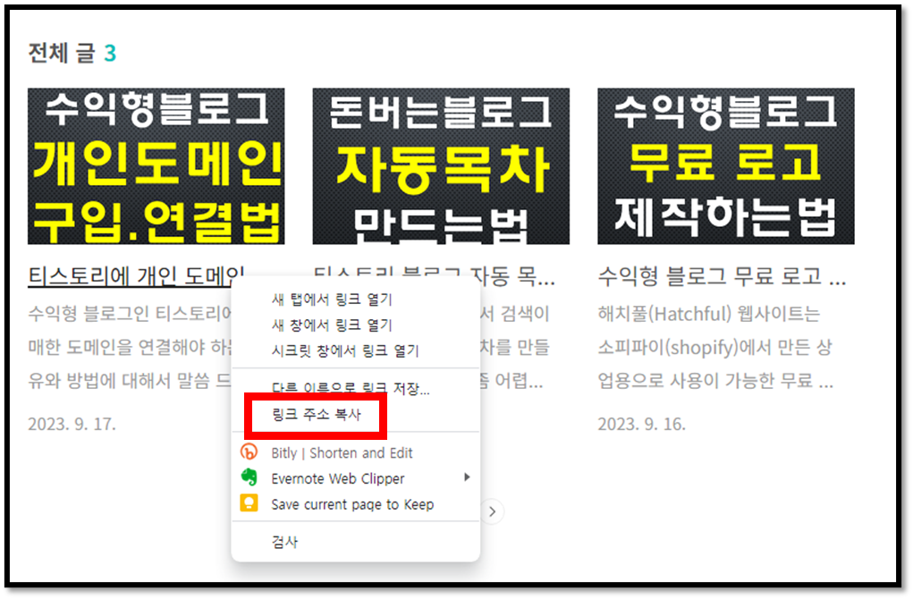 내 블로그 글리스트에서 우클릭 후 '링크주소복사'를 합니다.