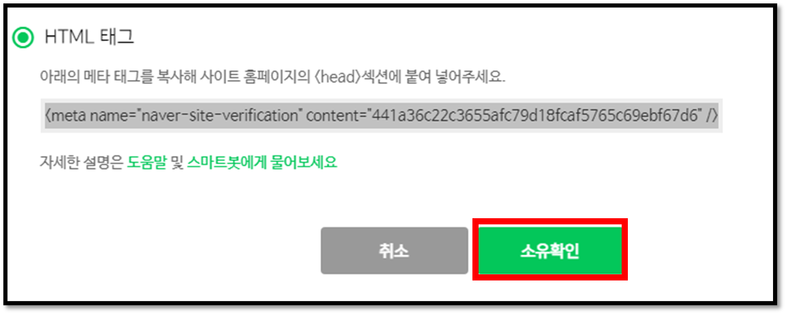 네이버 서치어드바이저에서 아래와 같이 '사이트 소유확인' 이 나옵니다. 'HTML 태그'를 선택한 후 메타태그를 복사합니다.