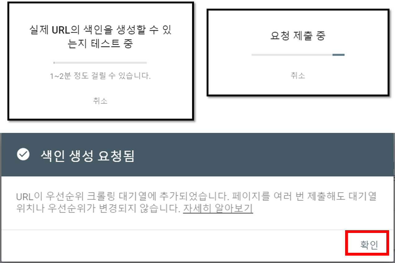 아래와 같이 나옵니다. 잠시 기다리세요. 색인생성요청됨 화면이 나오면 '확인'버튼 클릭합니다.