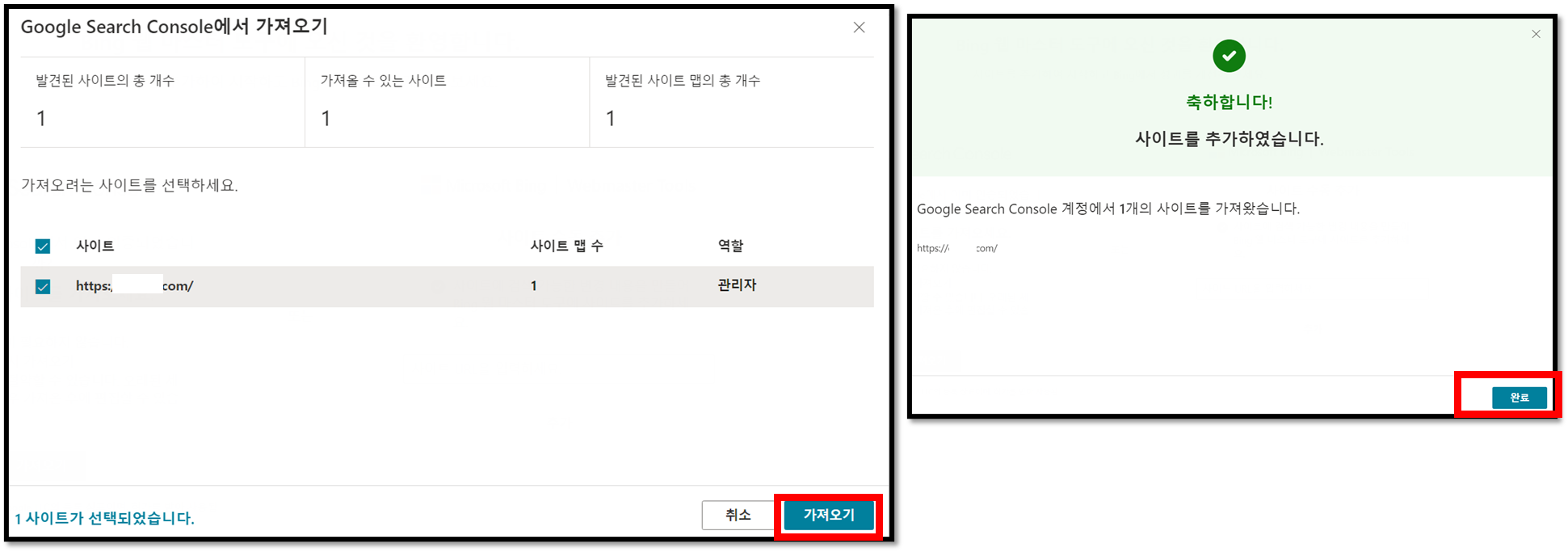 구글서치콘솔에서 가져오기 화면에서 '가져오기' 클릭합니다. '완료' 클릭합니다.
