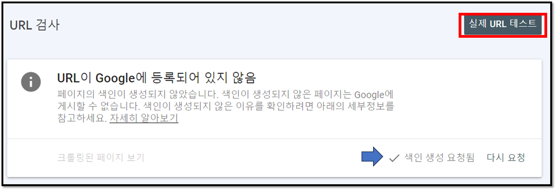 만약 이미 색인이 되어 있는 페이지 내용을 변경했거나 업데이트 했을 경우, '실제 URL 테스트'를 클릭하세요.