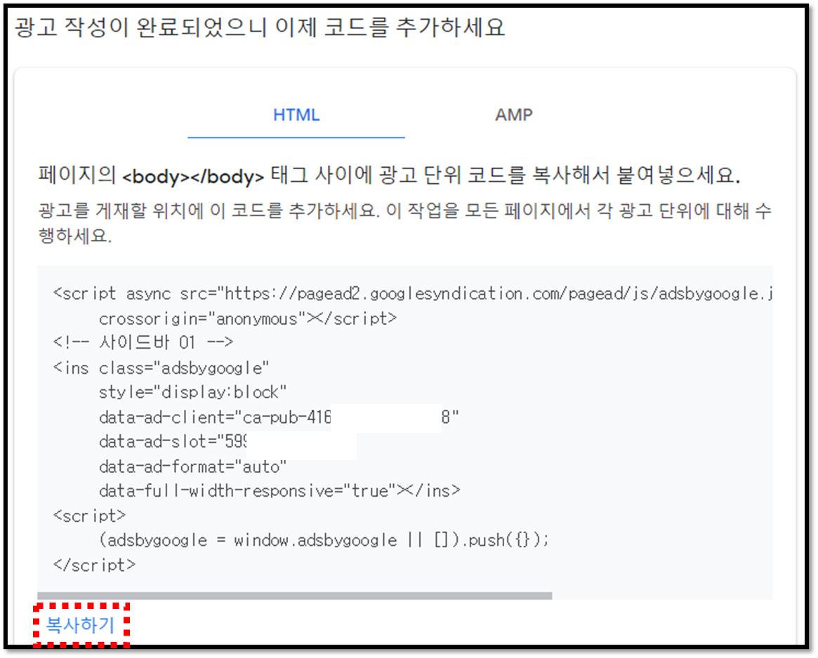 html 코드가 생성되었습니다. '복사하기'를 클릭한 후 완료 합니다.