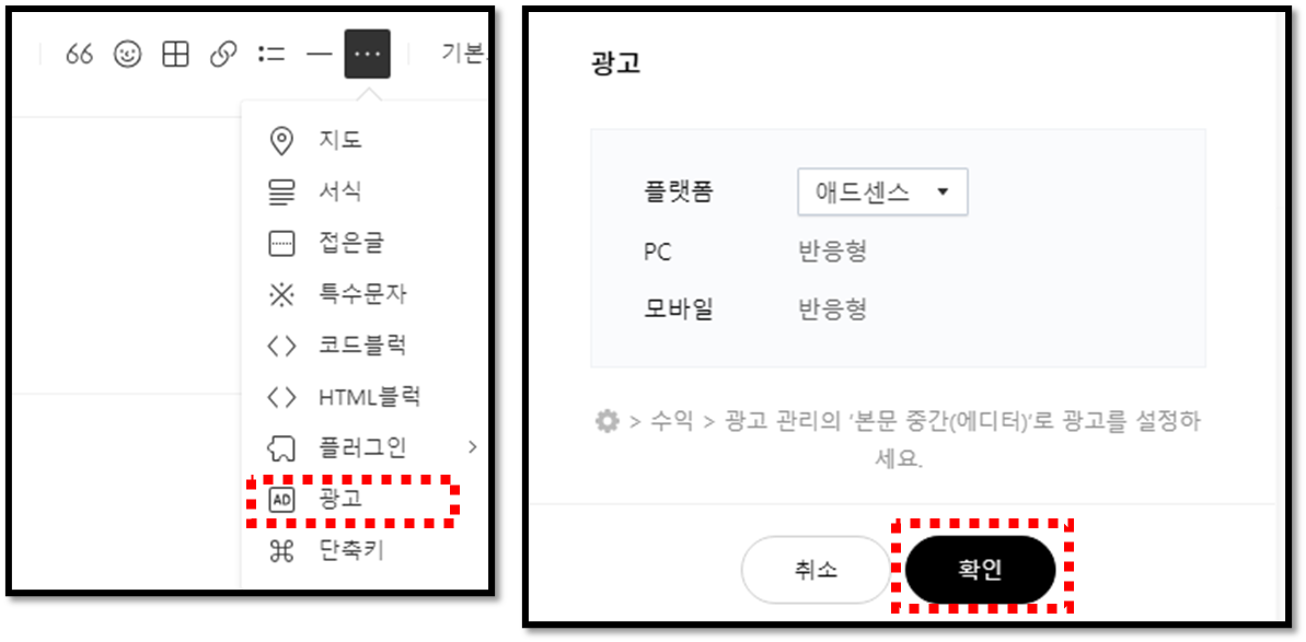 블로그 글쓰기를 할때 넣고 싶은 곳에 커서를 두고 상단 에디터에서 '점 세개가 있는 아이콘 클릭/광고 클릭' 합니다. 광고를 넣겠다는 알럿창이 나오면 '확인' 을 클릭하세요. 그러면 커서가 있는 곳에 애드센스 광고가 들어갑니다. 본문에 너무 많은 광고를 붙이면 독자들에게 거부감을 주니 적당히 넣으세요. ^^